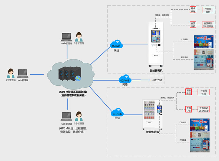 2、一機多用:商品自助售賣,廣告精準推送,客流統(tǒng)計分析等。