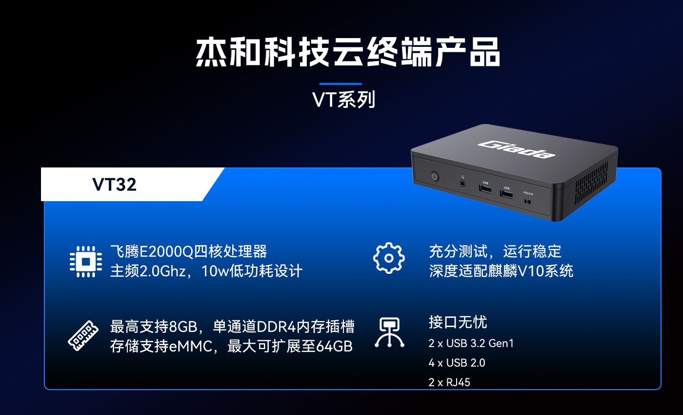 近期杰和科技推出的云終端VT32,以國產飛騰E2000Q芯片作為核心處理器,深度適配國產銀河麒麟V10系統(tǒng),在政務、金融等對數(shù)據(jù)安全要求極高的領域深受關注。