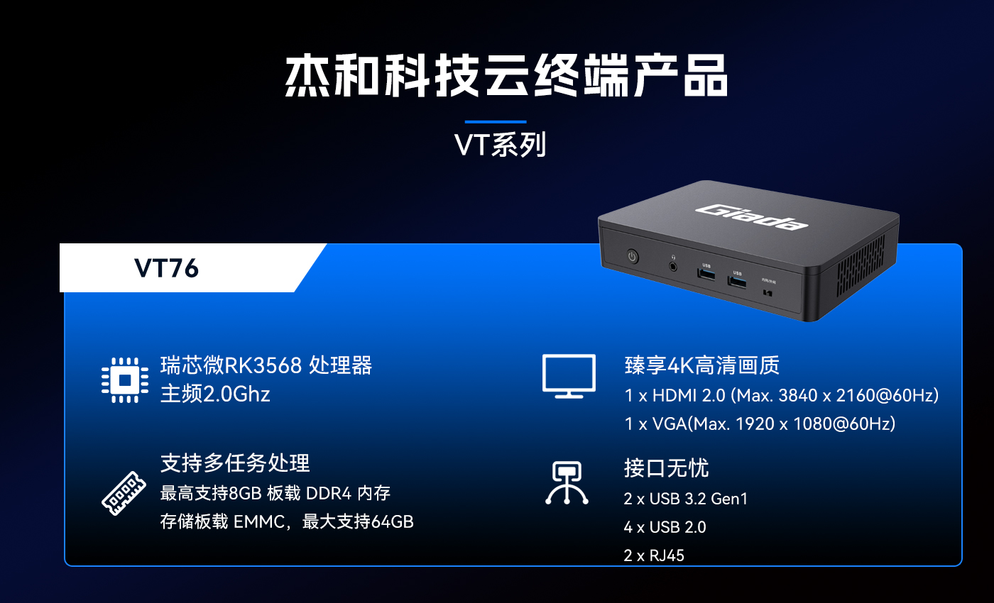 與之外形相似的云終端VT76,支持ARM架構,搭載瑞芯微RK3568處理器,適配debian系統(tǒng),適用于教育、辦公、開源等應用場景,能夠滿足不同用戶對于軟件安裝和使用的多樣化需求。