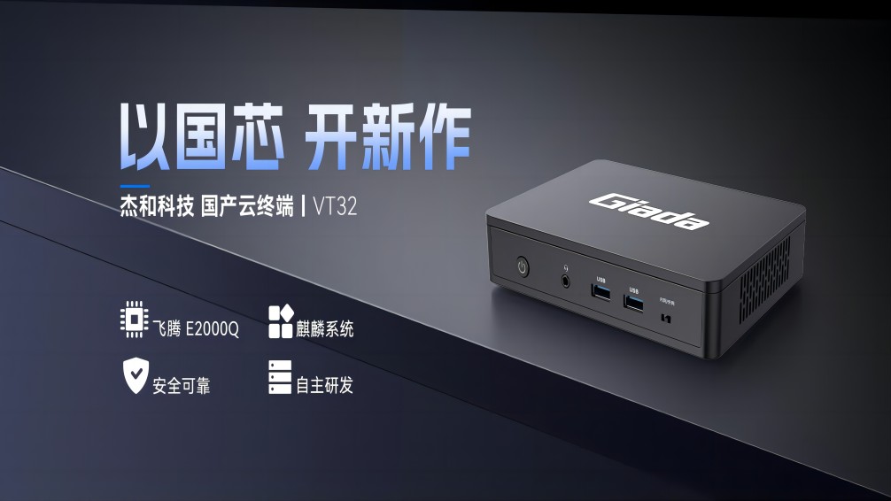 杰和科技推出的國產化云終端VT32,這款產品采用國產飛騰騰瓏E2000Q四核處理器,主頻達2.0GHz深度適配銀河麒麟V10系統,麒麟V10系統不僅能滿足金融辦公、政府辦公對于數據安全與隱私保護的要求,還支持多樣化部署與管理。