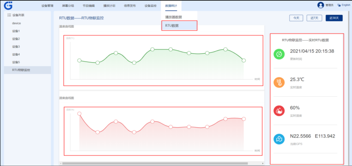 數據聯動:通過點擊“RTU 數據”模塊,外接傳感器(溫濕度/GPS等)自動采集數據,同步至大屏可視化更新