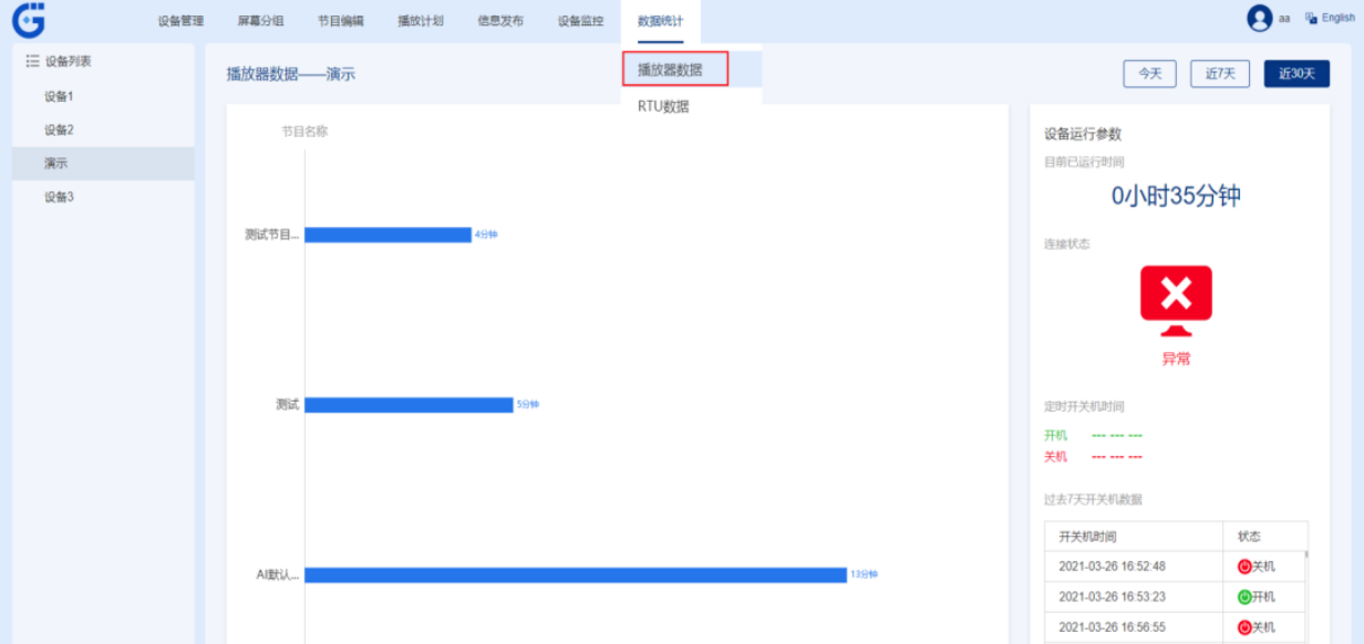 遠程管理:管理人員可以隨時通過后臺查看每臺設備的配置詳情、廣告日程、節目發布情況等,也支持在線開關機、調試設備電源、應用、音量以及顯示等節目播放條件