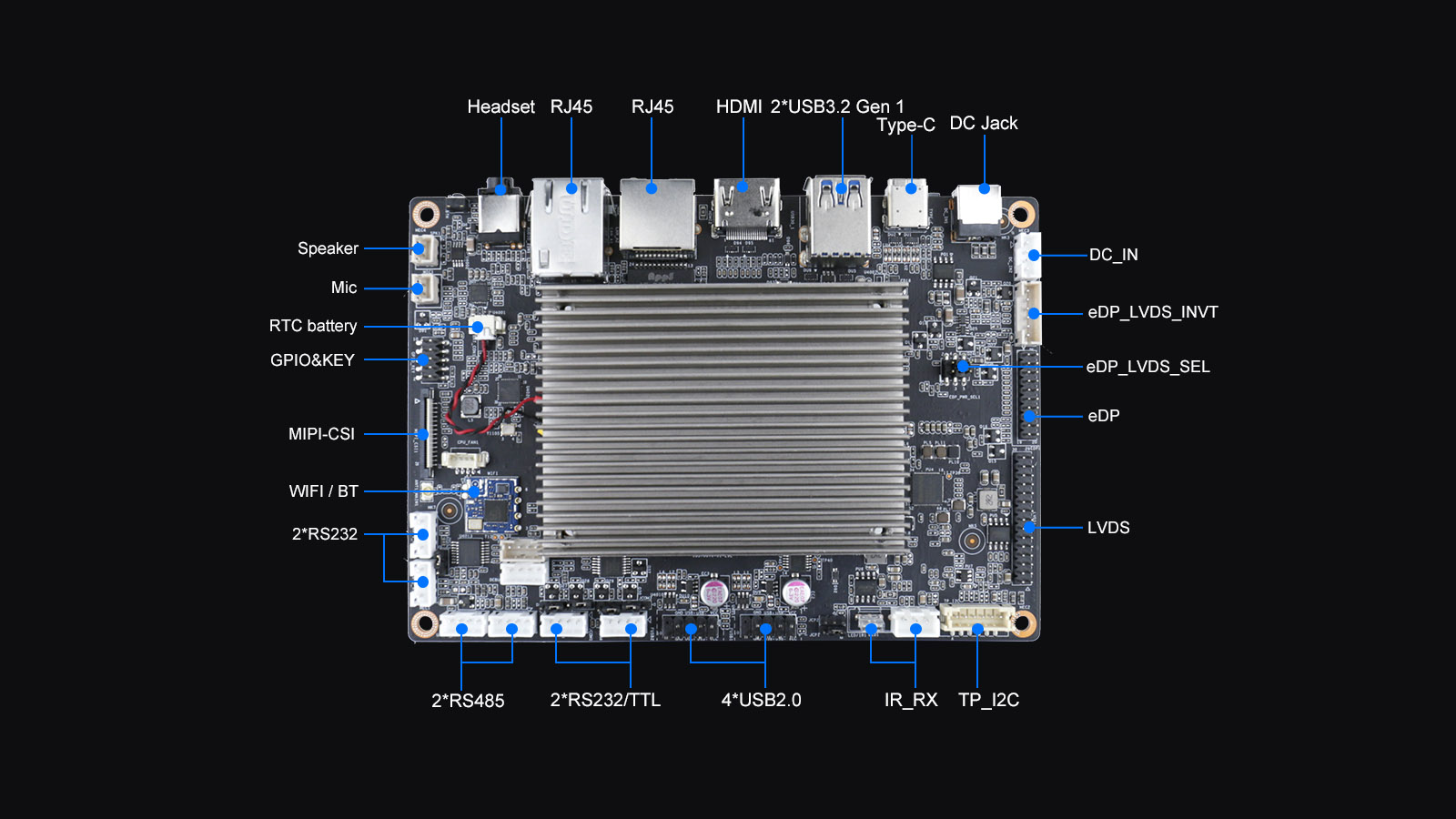 在內存與存儲方面,該主板板載LPDDR4X內存,最大支持16GB容量;支持1個eMMC(最大128GB)和1個Micro SD卡槽,滿足用戶多樣化的存儲擴展需求。