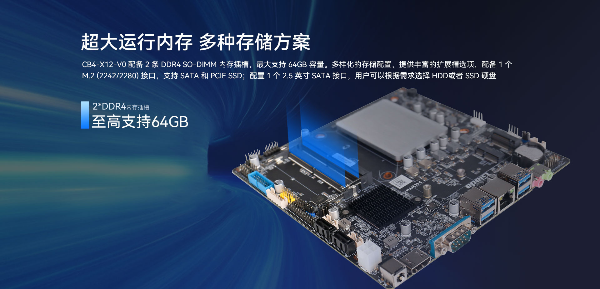 | 存儲 | 類型 | 1 x M.2(2242/2280) for(pcie3.0 x4/SATA)SSD 2 x SATA for HDD/SSD |